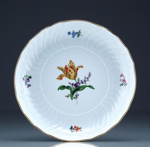 Porzellan, glasiert. Tief gemuldete Form mit steiler Fahne. Aus dem Service "Neubrandenstein". Der Spiegel mit Tulpe und Streublümchen in polychromer Aufglasurmalerei dekoriert. Rand goldstaffiert. Am Boden zweifach gestrichene Schwertermarke und Malerzeichen in Unterglasurblau, Preßmarke und Malerzeichen in Eisenrot.