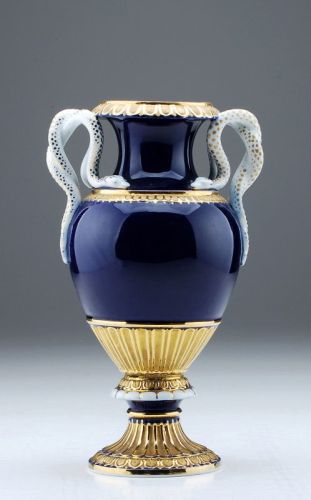 Porzellan, glasiert. Ovoider Korpus mit hochgezogenen Handhaben in Form verschlungener Schlangenpaare. Montierter, profilierter Rundfuß. Kobaltblauer Fond, reiche ornamentale, reliefierte Goldstaffage. Boden mit Schwertermarke und Malerzeichen in Unterglasurblau, Formnr. "E. 153" und Prägemarke. Verfugung zwischen Fuß und Korpus minimal ausgebrochen.