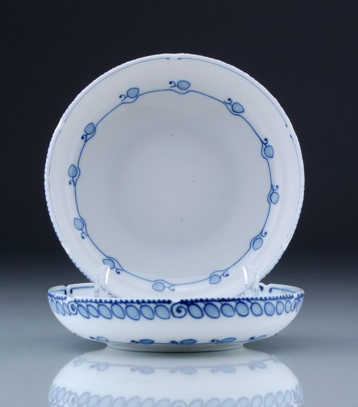 Porzellan, glasiert. Tief gemuldete Formen, die Mündungsränder regelmäßig gekerbt; die Wandungen mit reliefierter Punktbordüre. Auf den Wandungen und Fahnen stilisierte Blatt- und Rankenornamente in kobaltblauer Unterglasurmalerei. Schwertermarken in Unterglasurblau, vierfach gestrichen. Verschiedene Präge- und Beizeichen in Unterglasurblau. Entwurfsjahr: 1903-1905.