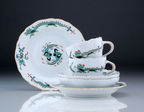 Porzellan, glasiert. Sechsteilig, bestehend aus zwei Tassen mit Untertassen sowie zwei Desserttellern. Aus dem Service "Neuer Ausschnitt". Tassen glockenförmig gebaucht; mit leichter Einziehung des Korpus unter der Wandungsmitte; Palmettenhenkel. Die Untertassen gemuldet und mit hochgezogenem Mündungsrand; die Dessertteller flach, mit abgesetzten Fahnen. Wandungen, Spiegel und Fahnen mit dem Dekor "Reicher Drache" in Grün in Aufglasurfarben staffiert sowie rot- und goldschattiert. Die Mündungsränder mit Goldfaden. Die Böden mit Schwertermarken in Unterglasurblau, geprägte Bossierernummern, Jahreszeichen sowie Formnummern. Beizeichen in Aufglasurrot.
