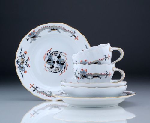 Porzellan, glasiert. Sechsteilig, bestehend aus zwei Tassen mit Untertassen sowie zwei Desserttellern. Aus dem Service "Neuer Ausschnitt". Tassen glockenförmig gebaucht; mit leichter Einziehung des Korpus unter der Wandungsmitte; Palmettenhenkel. Die Untertassen gemuldet und mit hochgezogenem Mündungsrand; die Dessertteller flach, mit abgesetzter Fahne. Wandung, Spiegel und Fahne mit dem Dekor "Reicher Drache" in Schwarz in Aufglasurfarben staffiert sowie rot- und goldschattiert. Die Mündungsränder mit Goldfaden. Schwertermarken in Unterglasurblau, geprägte Bossierernummern, Jahreszeichen sowie Formnummern. Beizeichen in Unterglasurblau sowie Aufglasurrot.