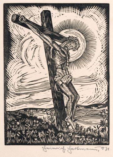 a) Heinrich Hartmann "Jesus am Kreuz". 1931. Holzschnitt. Verzeichnis der Balderpresse A 243.