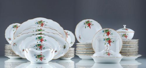 Porzellan, glasiert. 60-teilig. Bestehend aus 13 große Speisetellern, 13 Tellern, 12 Suppentellern, 12 Desserttellern, vier verschieden großen ovalen Platten, einem großen Anbietteller, runder Schale, quadratischer Schale, tiefgemuldeter quadratischer Schale, ovaler Platte mit aufgestellten Handhaben und Terrine. Serviceform mit geschweiften Rändern. "Johannisbeerdekor" in polychromer Aufglasurmalerei, Ränder goldstaffiert. Am Boden Meissen-Marke im Oval mit Stern in Unterglasurblau und Preßmarke "Meissen", teilweise Prägenrn. und Malerzeichen.