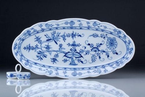 Porzellan, glasiert. Länglich ovale, leicht gemuldete Form mit wellenförmig geschweiftem Mündungsrand. Spiegel und Fahne mit dem Dekor "Zwiebelmuster" in kobaltblauer Unterglasurmalerei. Am Boden in Unterglasurblau sowie mit der Prägemarke "MEISSEN" gemarkt, verschiedene Prägezeichen.