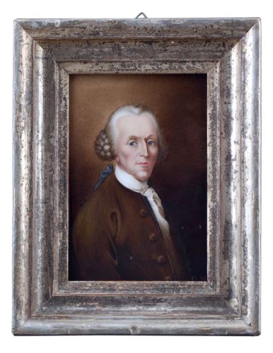 Porzellan, glasiert, in polychromen Aufglasurfarben staffiert. Nach einem Gemälde von Anton Graff aus dem Jahr 1769. Monogrammiert "EN" u.re.. Verso nachträglich von fremder Hand in Schwarz bezeichnet "Chr.-F.-Gellert". Auf der Deckplatte der Leiste bezeichnet "Christian Fürchtegott Gellert". In einer profilierten, schellackpolierten Holzleiste gerahmt.