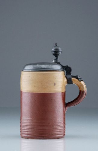 Steinzeug, glasiert, grauer Scherben. Zylindrischer Korpus, die Wandung durch Wechsel von breiten Rillenbändern und mittig glatter Fläche horizontal gegliedert. Das obere Drittel in hellbrauner Salzglasur, der untere Teil in Mittelbraun salzglasiert. Montierter Zinndeckel mit kugelförmiger Daumenrast, am Henkelansatz durchbrochen gearbeitet, oberseitig monogrammiert "C.G." und datiert.