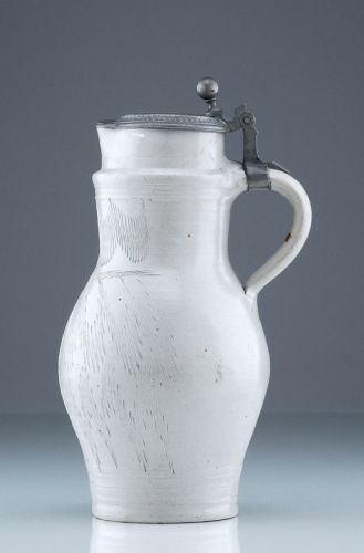 Steinzeug, heller Scherben, grau salzglasiert. Birnenförmiger Korpus mit breitem Bandhenkel und flachem Zinndeckel mit kleiner kugelförmiger Daumenrast. Wandung an der Front mit graphischem Ritzdekor, Eichmarke "2L" seitlich. Montierter Zinndeckel mit umlaufendem Blattkranz am Rand und Monogramm "K.St."