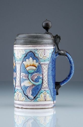 Fayence, beigefarbener Scherben, gräulich-weiß glasiert. Zylindrischer Korpus mit montiertem Zinndeckel. Wandung in polychromen Scharffeuerfarben dekoriert. Mittels Pilaster gegliedertes Dekor, Kartuschen mit stilisierten Blumen auf gestupptem, blauem Grund. Zinngefasster Mündungsrand, Zinndeckel mit kugelförmiger Daumenrast. Auf dem Deckel Tondo mit einer Kreuzigungsgruppe. Innenseitig mit Meister- und Stadtmarken (nicht aufgelöst).
