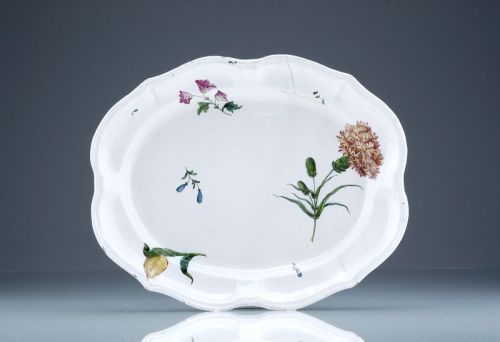 Fayence, grauer Scherben, gräulich-weiß glasiert. Ovale, leicht gemuldete Schale mit passiger Fahne. Fahne und Spiegel mit "Deutschen Blumen" in Aufglasurmalerei dekoriert. Boden mit Pinselmarke in Schwarz.