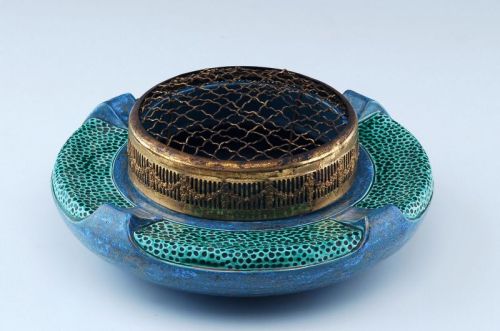 Steingut, blau und türkisgrün glasiert. Messingmontierung. Stark gedrückter, kugeliger Korpus mit eingezogenem Hals. Die Wandung vierstrahlig rhythmisiert, die Binnenflächen mit Punktdekor. Der Mündungsrand mit Messingdraht-Montierung, umlaufend mit reliefiertem Blumenkranzdekor. Am Boden gepreßte Firmenmarke in Fensterform, Prägestempel "Austria" und Formnr. "7419".