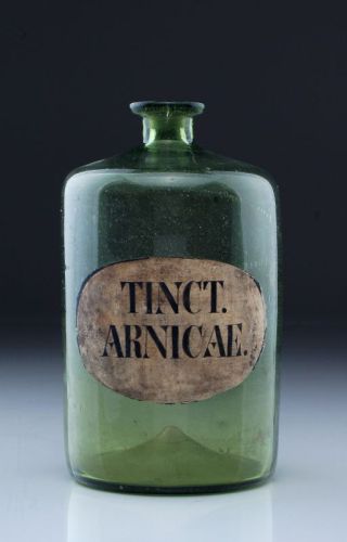 Grün getöntes, blasiges Glas. Zylindrischer Korpus mit stark eingezogener Schulter, kurzem zylindrischen Hals und ausgestelltem Mündungsrand. Auf der Wandung ein querovales Medaillon in Emaillemalerei mit der Bezeichnung "TINCT. ARNICAE." in Schwarz auf hellem Grund. Hochgestochener Boden mit Abriß.