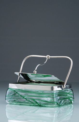 Klarglas und Nickelsilber. Flache, quaderförmige Dose mit Metalldeckelmontierung. Wandung mit lindgrünen Fäden unregelmäßig netzartig umsponnen. Deckel durch eine geschweifte Mittelstrebe mit dem Henkel verbunden und durch Herunterklappen des Henkels zu öffnen.