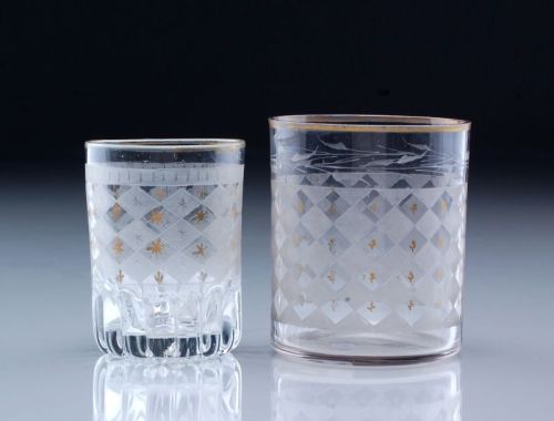 Farbloses Glas, partiell blasig und schlierig. Zylindrische Korpi, ein Glas mit sternförmig gebuckeltem Boden, in den Wandungsansatz übergehend. Die Wandungen beider Gläser umlaufend flächig mit einem mattgeschliffenen Rautendekor, zarter Blattbordüre bzw. Dekorband. Die Dekore partiell goldstaffiert; die Lippenränder mit Goldfaden.