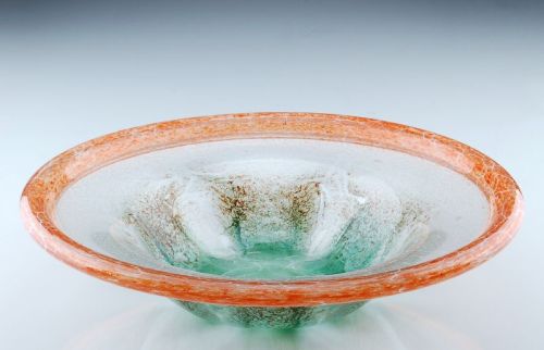 Mehrfarbiges Klarglas, sogn. Ikora-Glas. Tief gemuldete Form mit breiter Fahne und umgeschlagenem Mündungsrand. Gerippte Mulde. Spiegel mit grünen Pulver- und braunen Oxideinschmelzungen, die Fahne mit orangefarbenen Pulvereinschmelzungen. Feinblasiger, weißer Netzeinschluß, farbloser Überfang. Boden mit ausgekugeltem Abriß.