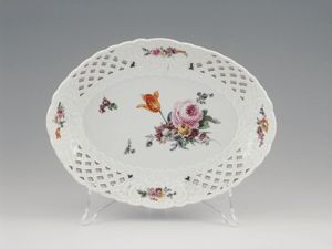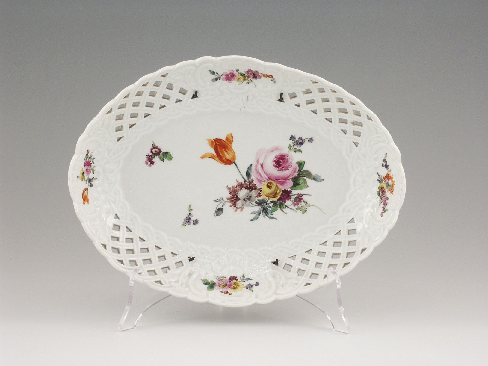 Ovale Obstschale mit durchbrochenem Rand und vier mit kleinen Blumenbouquets verzierten Kartuschen. Bunte Blumenmalerei. Schwertermarke in Unterglasurblau, Prägezeichen, Reste einer Inventarisierungsnummer.