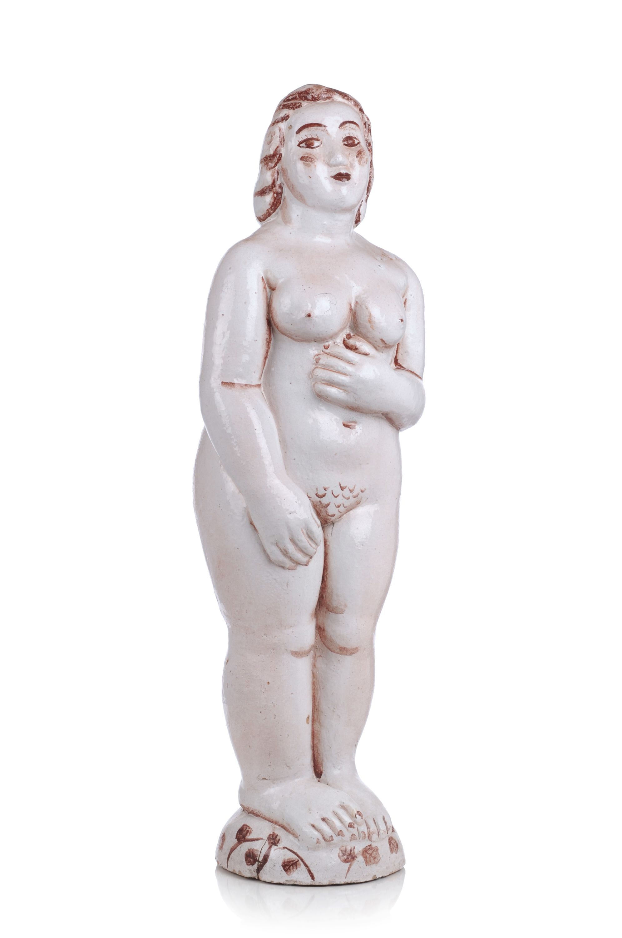 Großer Brandriss im hinteren Sockelbereich, kleinere im Bereich der Beine. Die Glasur partiell mit Krakelee, mehrere Glasurrisse und -unebenheiten, besonders im Bereich der re. Brust und des re. Oberarms. Mehrer kleine Einschlüsse und Fehlstellen, aus dem Werkprozess stammend. Herstellungsbedingtes Loch im Bereich des Kopfes. Am re. Bein, verso im Schulter- und Hüftbereich sowie am Sockel Abplatzungen bzw. Bestoßungen.