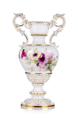 Porzellan, glasiert und in polychromer Aufglasurmalerei staffiert. Balusterform auf reliefiertem Rundstand. Konkav eingewölbter Hals, mittels Flechtbändern und Perlstabdekoren akzentuiert. Ausschwingende Mündung mit reliefiertem Eierstab. Zwei an der Wandung ansetzende, in sich verschlungene Blattreliefhenkel. Auf beiden Seiten der Wandung eine impressionistisch angelegte Mohnbukettmalerei. Die Reliefs goldgehöht, die Ränder mit Goldfaden. Unterseits die zweifach geschliffene Schwertermarke in Unterglasurblau, die geprägte Modellnummer "D 153", die Drehernummer sowie die Bezifferung "29" in Unterglasurblau.
