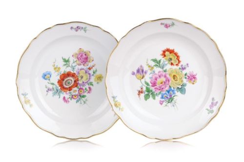 Porzellan, glasiert und in polychromen Aufglasurfarben, die Ränder mit Goldfaden. Aus dem Service "Neuer Ausschnitt". Gemuldete Formen mit ansteigender Fahne und geschweiftem Rand. Die Spiegel mit Blütenbuketts, auf den Fahnen je drei kleine Blütenzweige. Eventuell eine Außerhausmalerei. Unterseits die je zweifach geschliffenen Schwertermarken, seitlich mit vertikalem Schleifstrich sowie Dreher- und Formnummer.