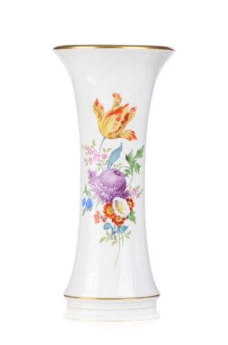 Porzellan, glasiert und in polychromen Aufglasurfarben staffiert, die Ränder mit Goldfaden. Zylindrische Form mit ausladendem Mündungsrand über ausgestelltem Rundstand. Auf der Wandung schauseitig ein Blütenbukett mit Tulpe, verso Blütenzweige. Unterseits die Schwertermarke in Unterglasurblau, die Modellnummer, die Drehernummer mit Jahreszeichen sowie Malerziffer und Dekornummer in Rot. Erstsortierung.