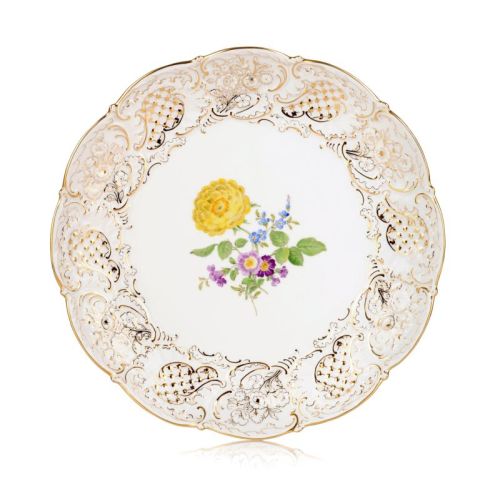 Porzellan, glasiert und in polychromen Aufglasurfarben und Glanzgold staffiert. Flache Form, zum geschweiften Rand ansteigend. Im Spiegel ein Bukett mit gelber, gefüllter Rose, Vergissmeinnicht und Aurikel (Blume 3 Mitte, bunt). Die Fahne mit einem reliefierten Rocailledekor, die Innenfelder alternierend mit einer Gitterstruktur und Blütenbuketts. Unterseits die zweifach geschliffene Schwertermarke, die geprägte Modellnummer "Z 83b", die Drehernummer mit Jahreszeichen, die Vergolder-, Dekor- und Malernummer.