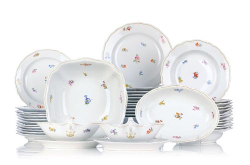 Porzellan, glasiert und in polychromen Aufglasurfarben staffiert. 40–teilig, bestehend aus 12 Speisetellern, 12 Suppentellern, 12 Abendbrottellern, einer großen viereckigen sowie einer kleinen, ovalen Servierschüssel sowie zwei Saucièren. Aus dem Service "Neuer Ausschnitt". Wandungen und Spiegel mit dem Dekor "Gestreute Blümchen", die Ränder mit ockerfarbenem Faden. Unterseits die Schwertermarken in Unterglasurblau sowie weitere Beizeichen, die Servierschüssel und Saucièren mit zweifach geschliffener Schwertermarke.