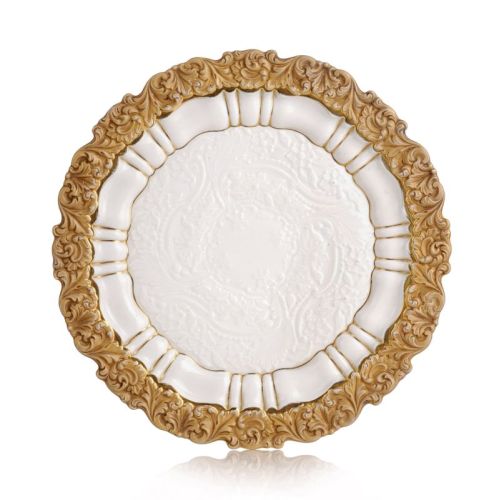 Porzellan, glasiert, die Fahne in Goldbronze staffiert sowie akzentuierende Linierung in Glanzgold. Flache Form, die im Karnies ansteigende Kehle in den geschweiften Rand mündend. Im Spiegel flächig ein florales Blüten-, Voluten- und Blattreliefdekor. Die Fahne mit einem Blattrankenrelief. Unterseits die zweifach geschliffene Schwertermarke, die geprägte Modellnummer, die Drehernummer mit Jahreszeichen sowie die Dekor- und Malerziffer.
