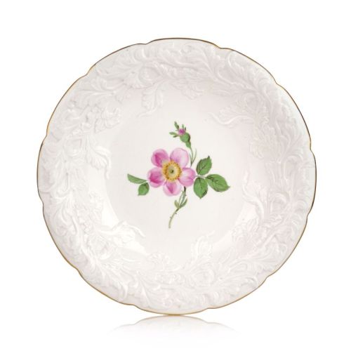Porzellan, glasiert und in polychromen Aufglasurfarben staffiert, der Rand mit Goldfaden. Gemuldete Form mit geschweiftem Rand. Der Spiegel mit einem Rosenzweig (Blume 2, Mitte). Die Fahne mit einem Blattkranz-Reliefdekor. Unterseits die zweifach geschliffenen Knaufschwerter, die geprägte Modellnummer "C 113" sowie die Malerziffer in Unterglasurblau.