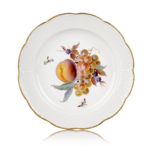 Porzellan, glasiert und in polychromen Aufglasurfarben staffiert. Leicht gemuldete Form, die Fahne mit dem Reliefzierat "Altozier". Im Spiegel Früchtemalerei mit Pfirsich, Weintraube und Insekten. Der Rand mit Goldfaden. Unterseits die vierfach geschliffenen Knaufschwerter sowie weitere Prägezeichen.
