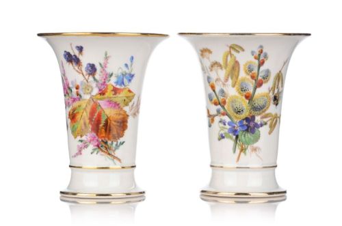 Porzellan, glasiert und in polychromen Aufglasurfarben staffiert, die Ränder mit Goldfaden. Zylindrischer Korpus über abgesetztem Sockel und weit ausladenden Mündungsrand. Die Wandungen der Vasen mit Frühlings- sowie mit Herbstzweigen und Insekten.