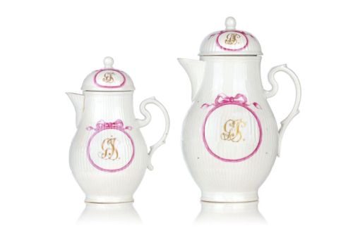Porzellan, glasiert und in Aufglasurgold und -violett staffiert. Birnenförmig gebauchte Korpi mit jeweils geschweiftem Ohrenhenkel und spitzem Ausguss. Die Haubendeckel mit knospenförmigem Knauf. Wandungen und Deckel mit dem Reliefdekor "Gebrochener Stab". Auf beiden Seiten der Wandung und der Deckel jeweils ein schleifenbekröntes Medaillon mit dem Monogramm "G.J.S.". Unterseits jeweils mit der Manufakturmarke in Unterglasurblau.