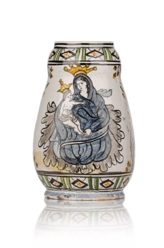 Fayence, rötlicher Scherben, glasiert und mit Scharffeuerfarben staffiert. Gebauchte, dreiseitig abgeflachte Form über kurzem Stand. Zur leicht eingezogenen Mündung nodusförmig, dreifach profilierter Bandhenkel. Zentral eine Kartusche mit dem Motiv der Marienverehrung. Maria und Jesus bekrönt und auf einer Wolke thronend, flankierend florale Elemente, oberhalb und unterhalb jeweils ein Fries mit Rautenmotiv. Verso unterhalb des Henkels in Schwarz datiert "1766". Ungemarkt.