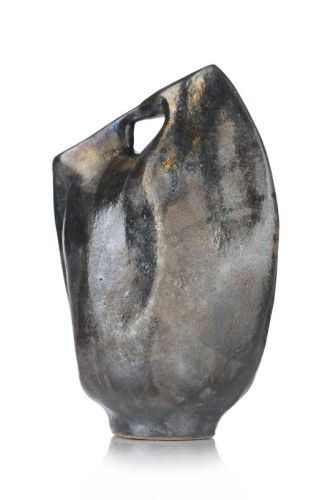 Keramik, ockerfarbener Scherben, in Raku-Technik dunkelbraun irisierend glasiert. Gebauchte, ovale Form mit unregelmäßigen Einziehungen in der Wandungsmitte. Die Mündung mit zwei ovalen bis tropfenförmigen Öffnungen. Unterseits geritzt ligiert monogrammiert und datiert.