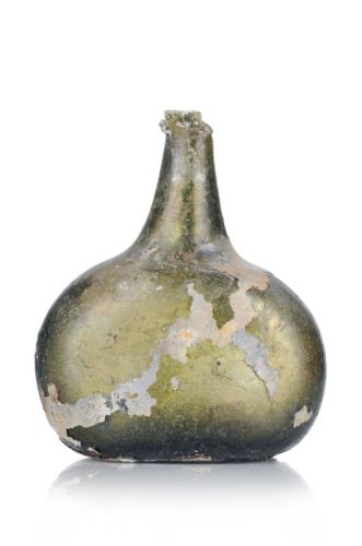 Irisierend grün getöntes Glas. Beidseitig abgeflachter, gebauchter Korpus mit verjüngtem Hals, die Mündung mit aufgelegtem Faden, der Boden mit eingestochenem Abriss. Bodenfund.