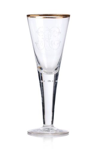 Farbloses Glas. Konischer Schaft mit neun eingestochenen Luftblasen über einem Scheibenfuß. Schaft in eine konische Kuppa übergehend. Auf der Wandung schauseitig ein Rankenmonogramm "PC" in Matt- und Blankschnitt. Der Lippenrand sowie der Standring mit Vergoldung. Der Boden mit kugelförmig ausgeschliffenem Abriss.