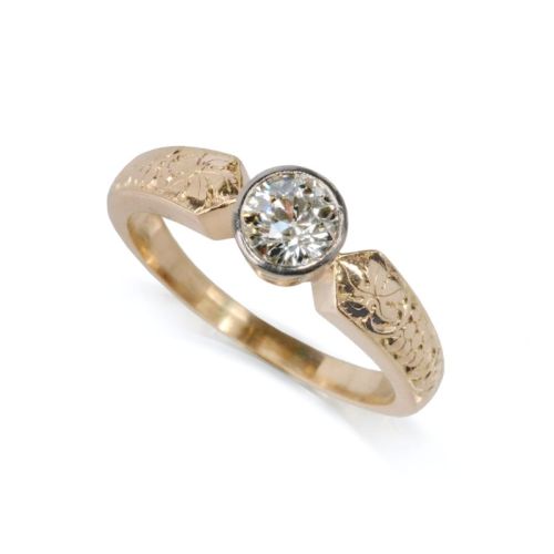 585er Gelbgold, Weißgold. Mittlere gerundete Schiene mit spitz zulaufenden, die reliefierten Schultern mit einem Weintraubendekor. Zentral ein Altschliffdiamant (D. ca. 6 mm, H. 3,5 mm, ca. 0,77 ct / VS) in leicht getöntem Weiß (J) in Zargenfassung. In der Schiene mit der Feingehaltsstempelung sowie einem gravierten "L".