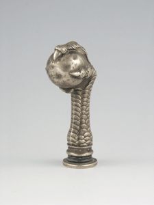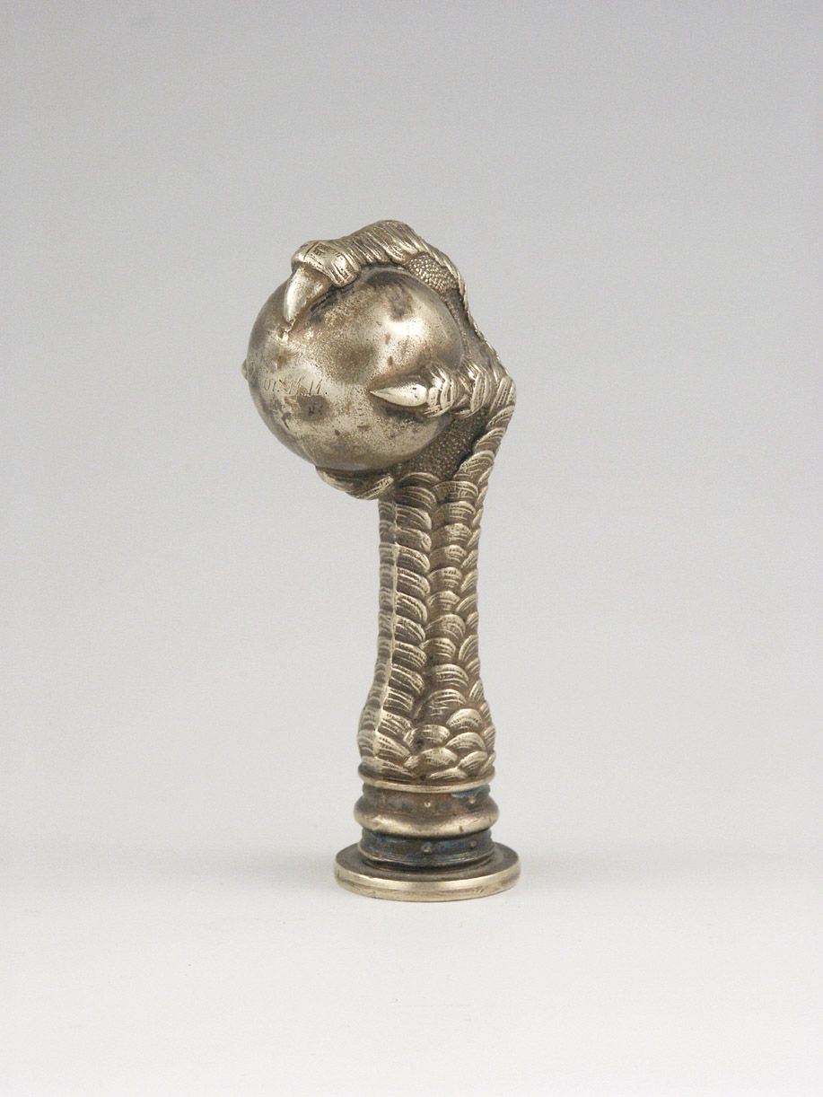 Silber. Griff in Form einer Raubvogelkralle, die eine Kugel mit dem biblischen Verweis 2 Cor. 11.11 ("...Warum? Etwa weil ich euch nicht liebe? Gott weiß es."...) hält. Runde Siegelplatte mit altgriechischer Inschrift.