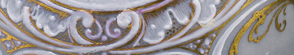Porzellan, glasiert. Schauseitig ein Florakopf im Profil in Pâte-sur-Pâte-Malerei im Oval auf hellgrauem Fond , gerahmt von Rocaillen, Blattwerk und Blüten in Pâte-sur-Pâte-Malerei und Gold, rückseitig eine Schwalbe in Pâte-sur-Pâte-Malerei. Am Boden mit der Knaufschwertermarke in Unterglasurblau, geritzter Form-Nr. "F 127" und Präge-Nr. "8".