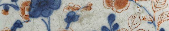 Porzellan, glasiert, unterglasurblau staffiert. Im Spiegel fünf Asternblüten, die Fahne mit einem Fries aus Kartuschen mit je einem Asterzweig mit Blüte. Boden mit Doppelring und Blatt in Unterglasurblau.