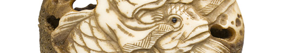 Der Unsterbliche Kinko sitzt auf dem Rücken eines Karpfens. Kinko lebte der Legende nach im 4. Jahrhundert v. Chr. im Staat Zhao. Nach einem Aufenthalt beim König der Fische ermahnte er seine Schüler, keine Fische mehr zu töten. Das Hirschhorn-Netsuke hat eine annähernd runde Form und wurde vom Schnitzer ausgehöhlt (Ryusa-Netsuke), damit es ein leichteres Gewicht und damit bessere Trageigenschaften hat.