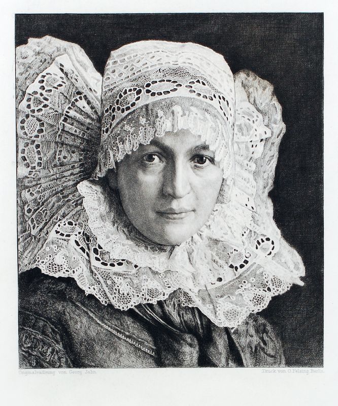 I. "Altschlesisches Mädchen", in der Platte typografisch bezeichnet "Originalradierung von Georg Jahn, Druck von O. Felsing, Berlin". WVZ Jahn 39.