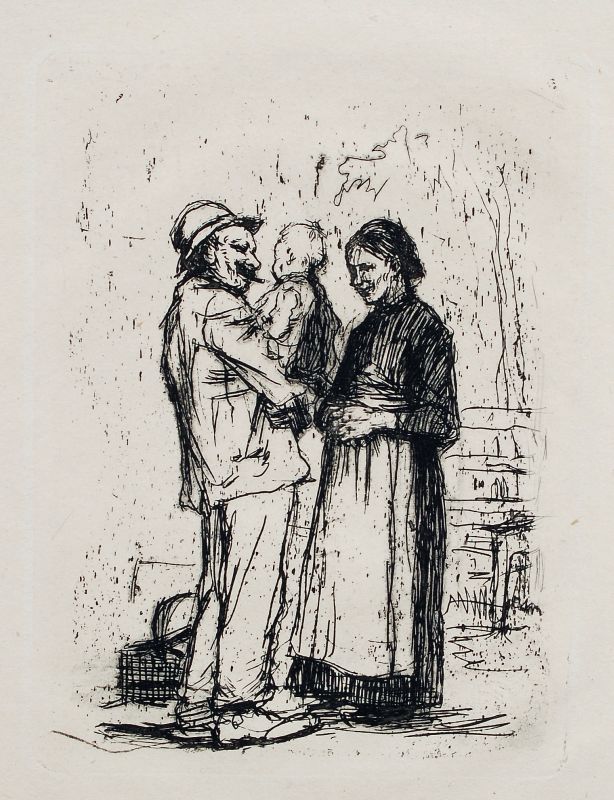 Etching auf Bütten. Unsigniert. In Blei von fremder Hand bezeichnet "Käthe Kollwitz, Begrüßung" u.li. Auf Untersatzkarton montiert.WVZ Klipstein 10 II a (von d).