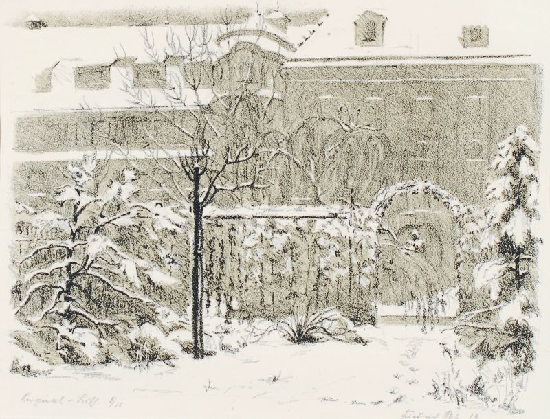 Etching, Holzschnitte und eine Lithographie. Mit Arbeiten von Friedrich Pelz, Siegfried Mackowsky, Ferdinand Steininger, Paul Sinkwitz, Walter Leistikow, Kurt Schuster. Drei Blätter in der Platte bzw. im Stock monogrammiert, teilweise in Blei signiert und bezeichnet.