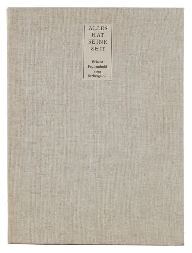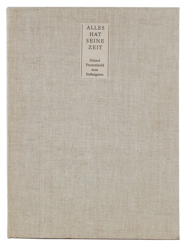 Mappe mit 16 graphischen Arbeiten u.a. von F. Cremer, H. Giebe, V. Hoffmann, J. Wenzel, W. Stötzer, E. Shaw, F. Press, K. Manzek und G. Eisler und einem Textband zum 60. Geburtstag von Erhard Frommhold. In der originalen Leinen-Klappmappe.