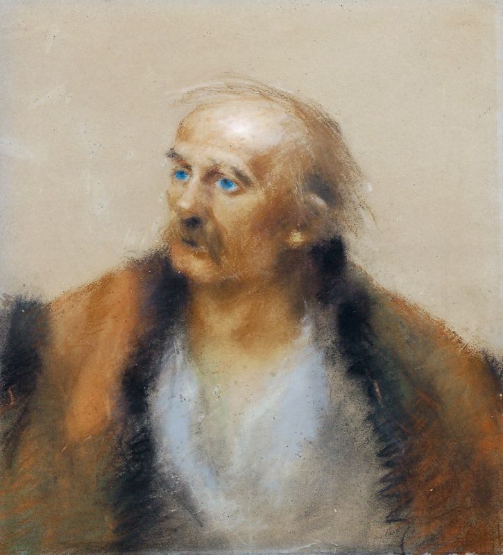 Pastel crayons in colours auf bläulichem Papier. U.li. in Blei signiert "T. Axentowicz". Im Passepartout hinter Glas gerahmt.
