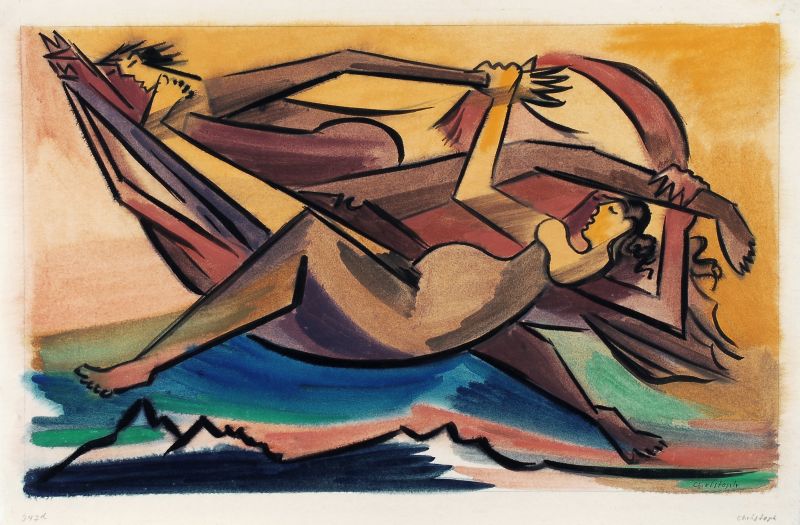 Watercolour, Tusche und farbige Pastellkreide auf chamoisfarbenen Papier. In Tusche und in Blei signiert "Christoph" u.re. An den Ecken auf Untersatzpapier montiert.