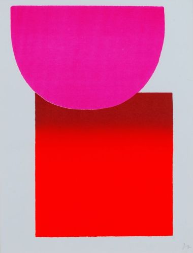 562 Rupprecht Geiger, Magentafarbener Halbkreis über rotem Quadrat. No date.