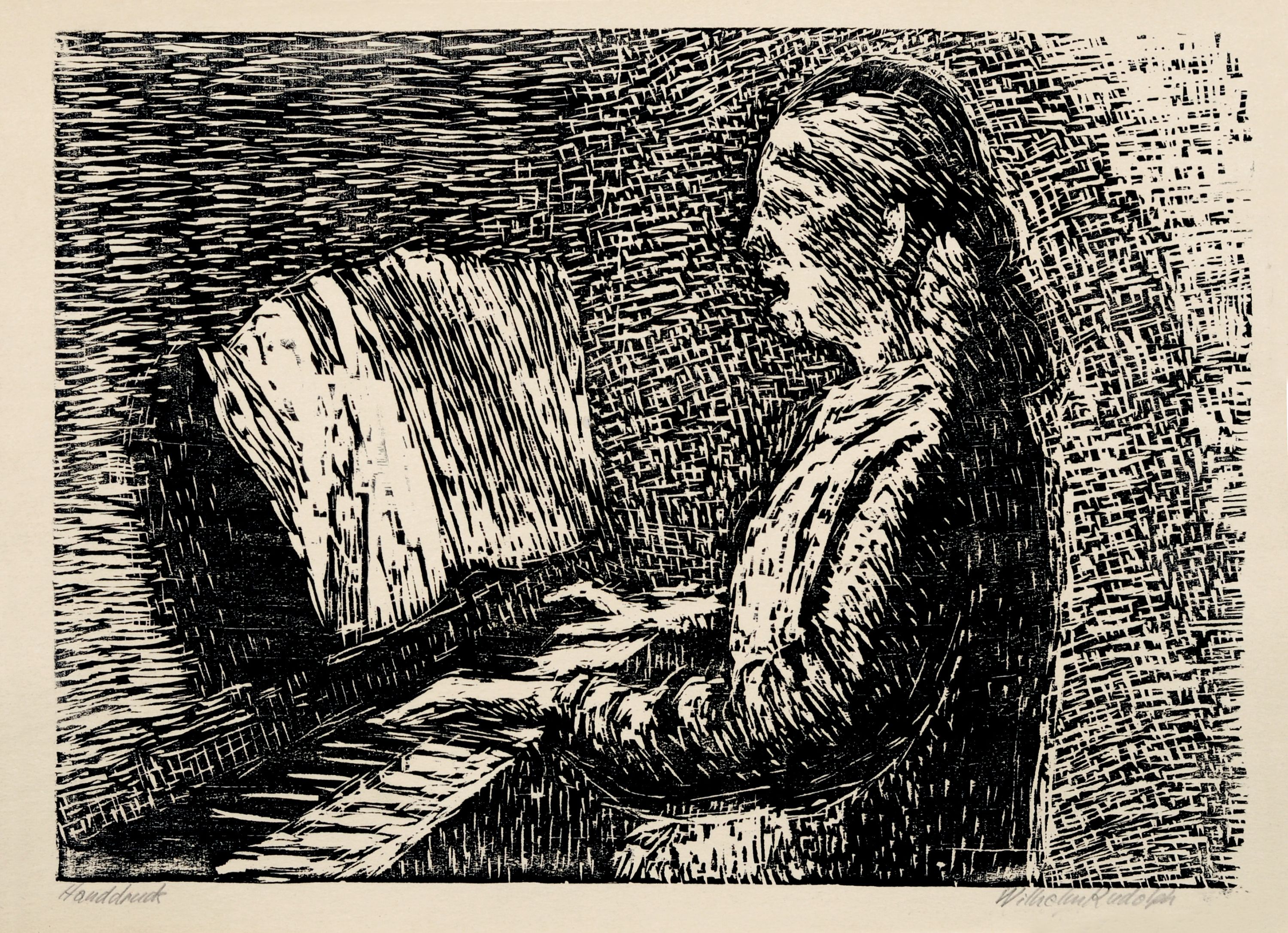 Wood cut auf Bütten. In Blei unterhalb der Darstellung signiert "Wilhelm Rudolph" re. sowie als "Handdruck" bezeichnet li.