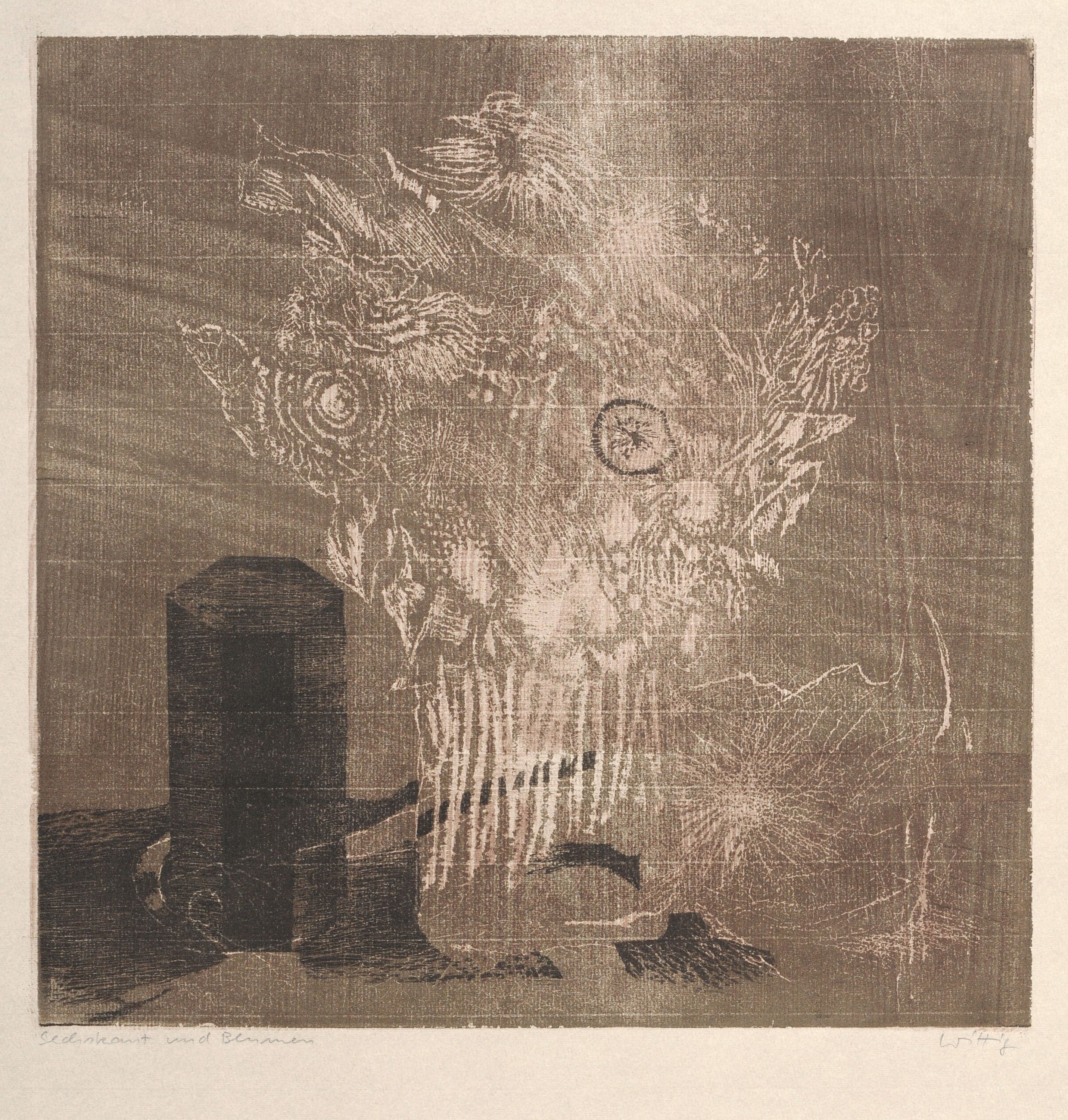 Wood engraving in colours. "Muschel, Schachtel, Apfel" auf chamoisfarbenem Bütten, Plakatauflage mit der Schrift. Unsigniert. Plakat für die Ausstellung "Werner Wittig. Malerei, Grafik." der Galerie Oben, Karl-Marx-Stadt, 25. April – 30. Juni 1977. "Sechskant und Blumen" auf grauem Bütten. In Blei signiert u.re. und betitelt u.li.