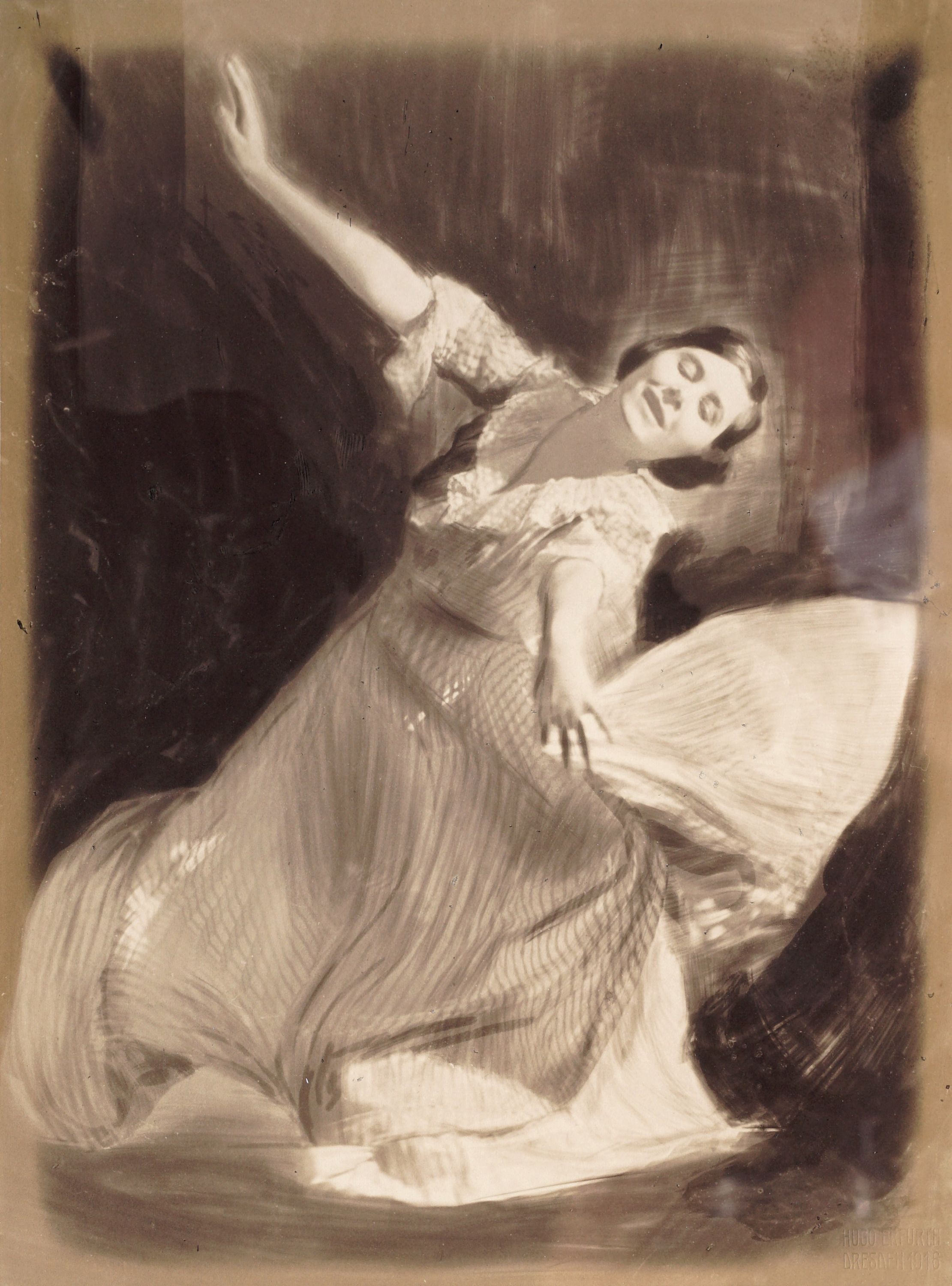 Silver gelatine print auf mattem, fein strukturiertem Papier. Kleine Retuschierungen in der Platte sowie im Bereich des Bildhintergrundes vom Künstler malerisch überarbeitet. Abzug von 1916. Mit Blindstempel u.re. "Hugo Erfurt Dresden 1916". An den o. Ecken auf Untersatzpapier montiert.